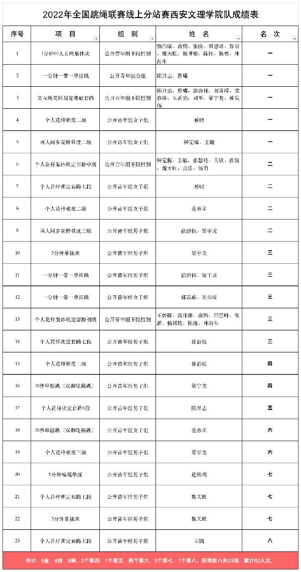 在由国家体育总局社会体育指导中心主办,全国跳绳推广委员会承办的“2022年全国跳绳联赛线上分站赛”中,公司跳绳队在教练员查毅、樊立恒、丁凯带领下,获:5金、4银、5铜、2个第四、1个第五、两个第六、3个第七、1个第八。累计获赛事前八名共23项,共60人次。