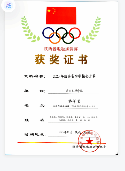 4.2023年11月陕西省啦啦操公开赛自选花球啦啦操特等奖;