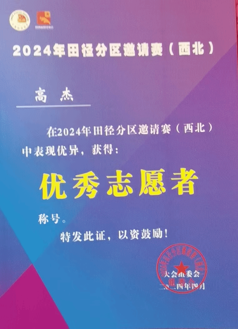 作为一名员工干部,我时刻注意自己的言行。在志愿中求奉献,投身参加陕西各类田径比赛,积极承担裁判工作,为陕西田径贡献一份力,累计志愿服务时长约350h。