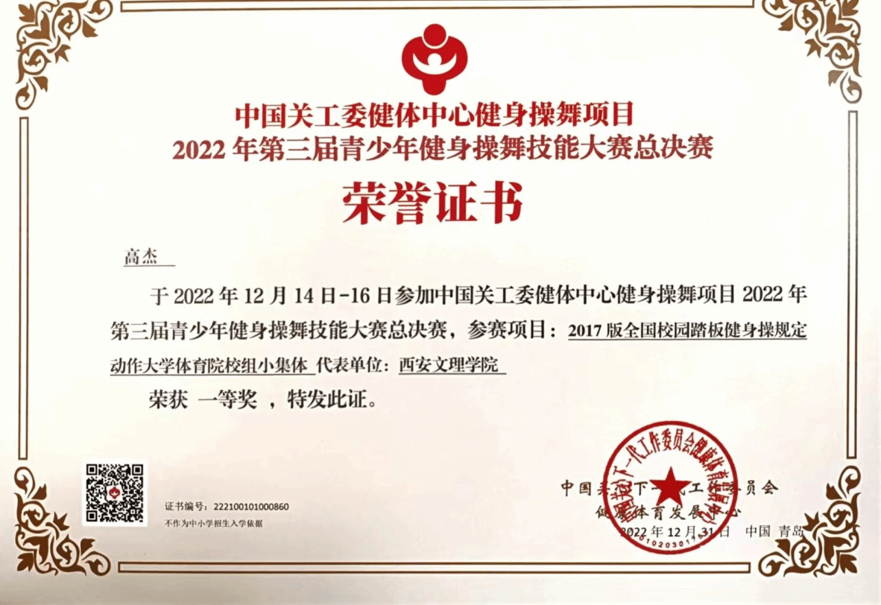 3.2022年11月陕西赛区员工健身操舞运动技术等级标准体育院校组小集体一等奖;