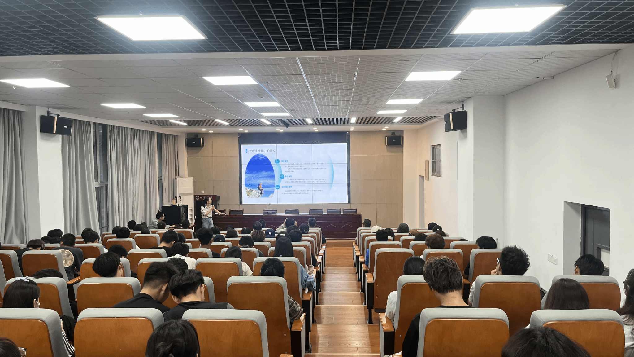 活动旨在深入贯彻省、市科学健身指导 “五进” 活动精神,引导师生养成科学健身和健康生活的良好习惯。来自西安市户外运动协会攀岩攀冰部部长吴勇奇和理事陈斯雅,凭借丰富的经验和深厚的专业知识,为师生们带来了一场知识盛宴。吴勇奇从户外运动的风险因素切入,深入浅出地剖析科学评估方法与应对策略,帮助师生们全面认识户外运动潜在风险及防范要点。陈斯雅则结合自己攀登珠峰的亲身经历,生动讲述了前期准备、团队协作和心理调适的关键作用,让大家深刻体会到户外运动对身体、意志及团队协作能力的综合考验。